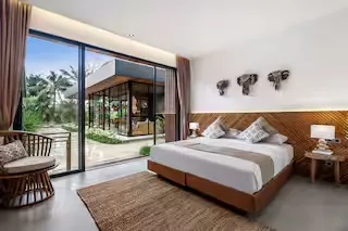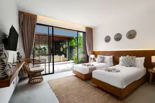 The luxurious modern villa features A/C, 5 private bedrooms with spa-like en-suites, and floor-to-ceiling glass doors that open to paradise.